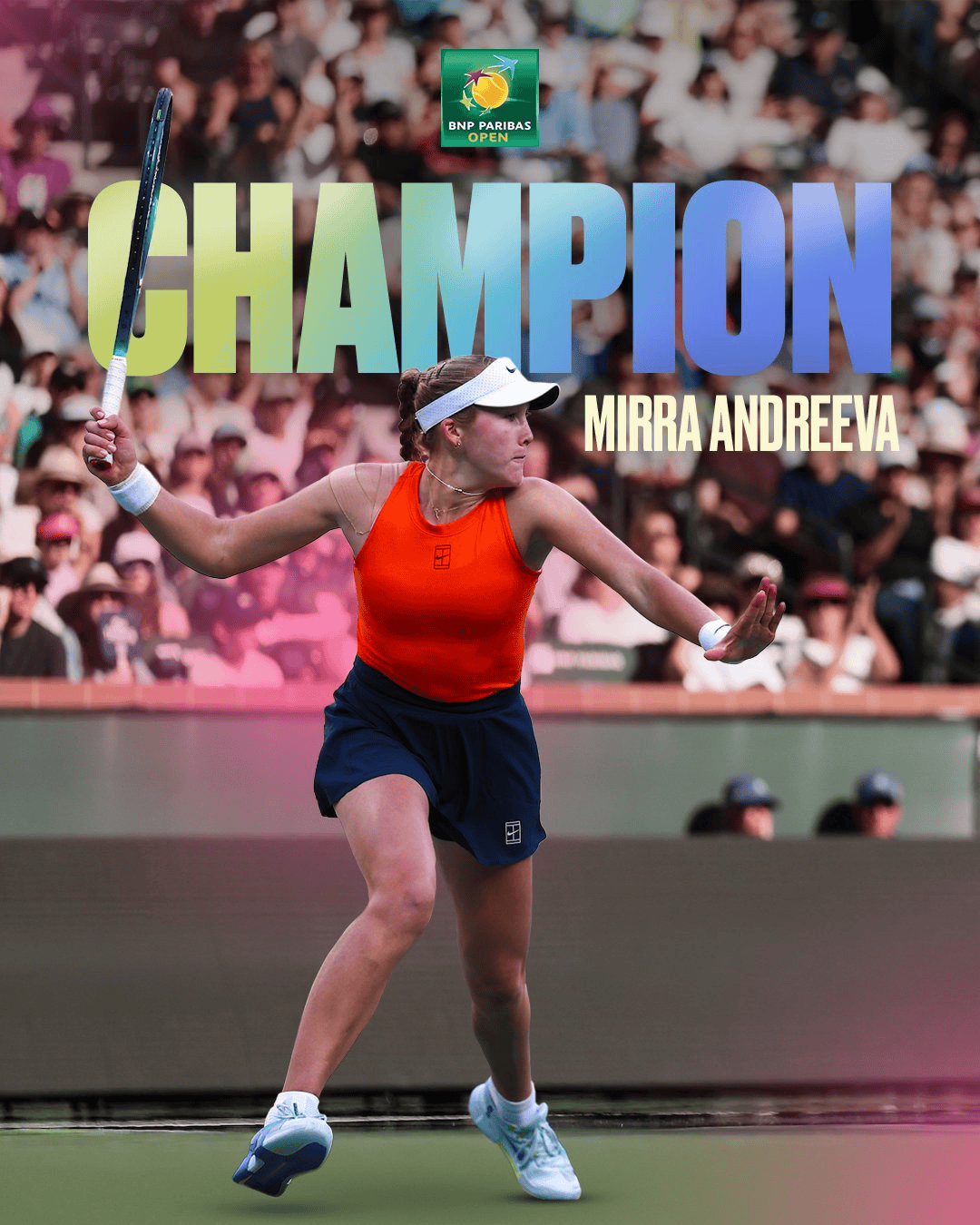 在迪拜站的夺冠,只是这位小将开启夺冠的开始。在印第安维尔斯站的比赛中,安德列娃再次让全世界的网球爱好者为之感叹。在16强赛中,安德列娃击败了世界排名第7的莱巴金娜。进入到了半决赛后,她在比赛中击败了强劲的对手,排名世界第2的斯瓦泰克。到了决赛中,面对世界排名第一的萨巴伦卡,安德列娃在落后的情况,展示出了强大的心理素质,以2:1逆转取胜,夺得冠军,这是她连续两站收获了1000赛的冠军。